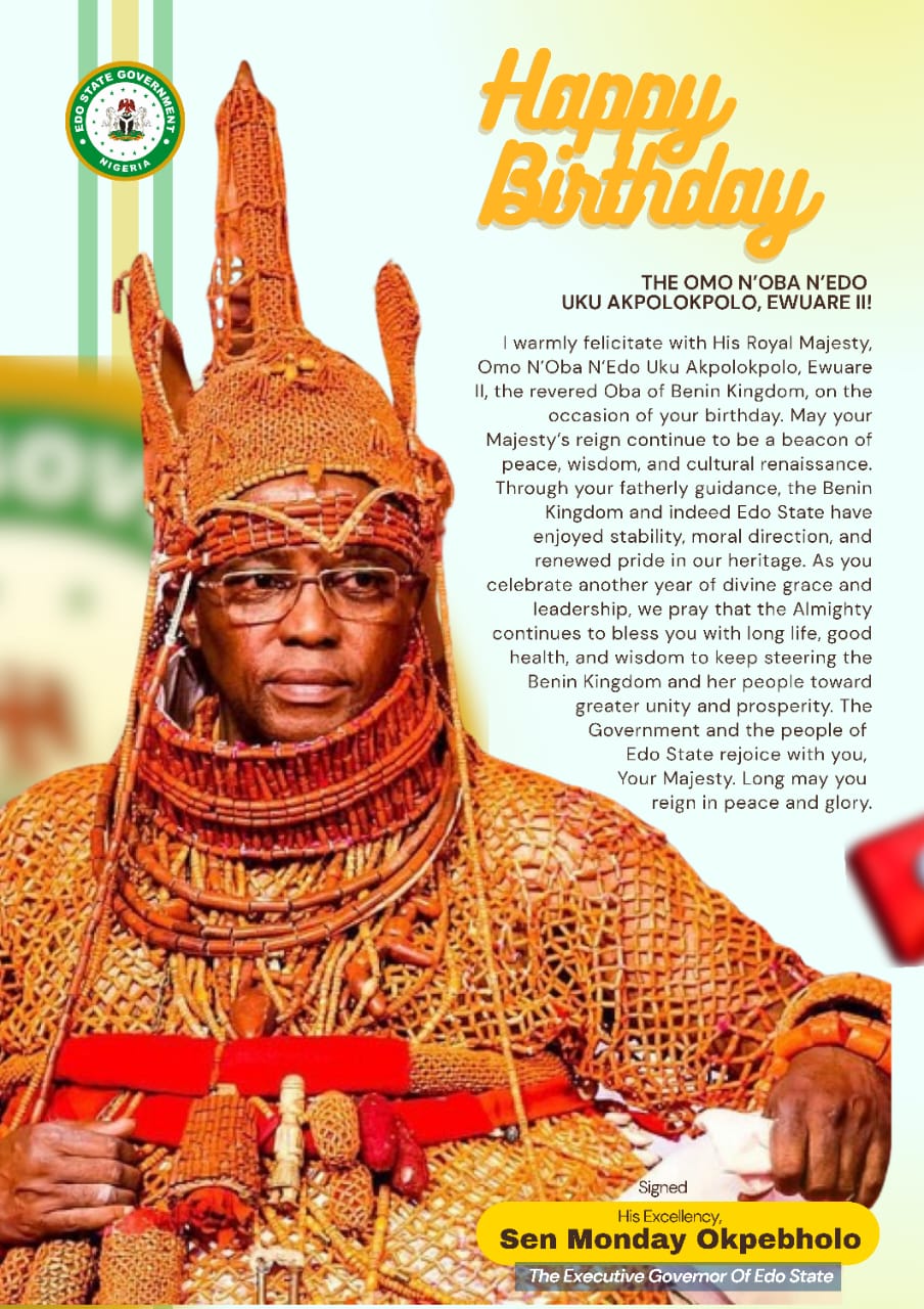 The Executive Governor of Edo State, His Excellency, Senator Monday Okpebholo, has extolled the revered Oba of Benin, His Royal Majesty, Omo N’Oba N’Edo Uku Akpolokpolo, Ewuare II, on the occasion of his birthday.