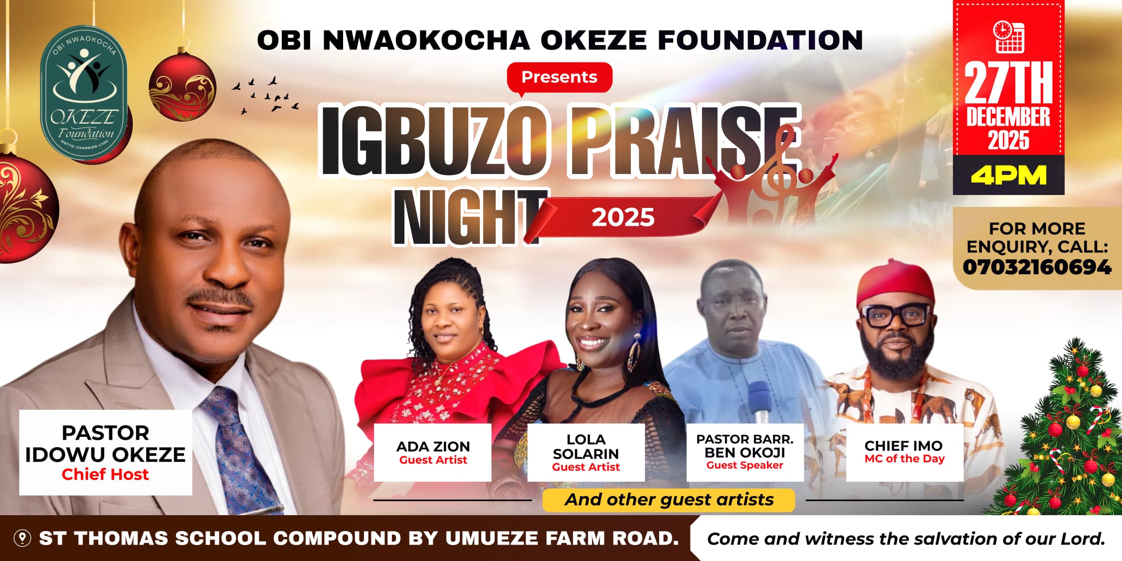 The Obi Nwaokocha Okeze Foundation is set to light up Igbuzo with a spirit-filled encounter as it organizes the Igbuzo Praise Night 2025, scheduled for 27th December 2025. The highly anticipated event will hold at the St. Thomas’s College Compound, Umueze Farm Road, Igbuzo, and promises to be one of the most transformative worship gatherings in the state.